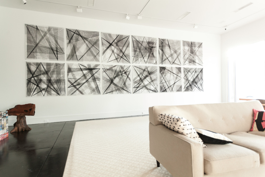 15,000 ft of string stretch over 12 wooden panels for this private art commission in Buckhead.  Spanning over 25 feet, the piece conveys a sense of action and intensity across the main wall of the formal living room.